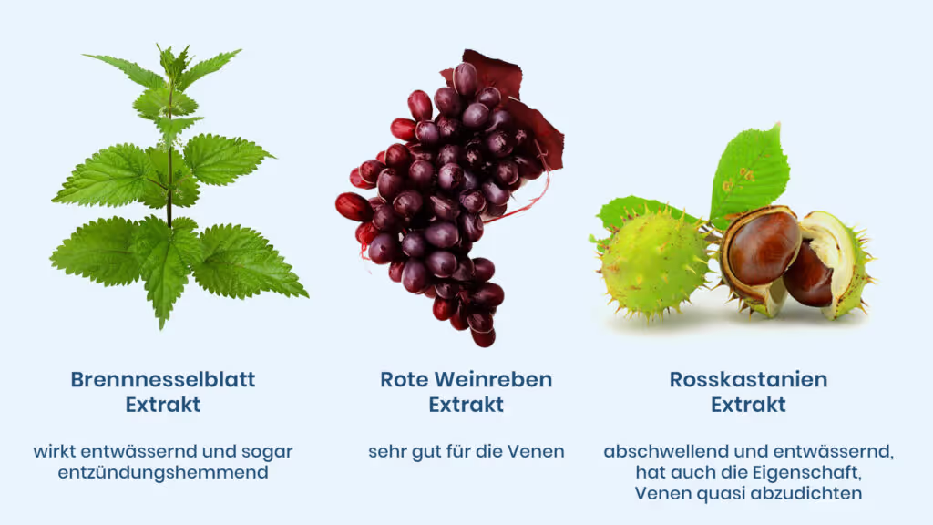 Denn der Rosskastanienextrakt und der rote Weinrebenextrakt stärken die Venen, das Bindegewebe und die Gefäße.